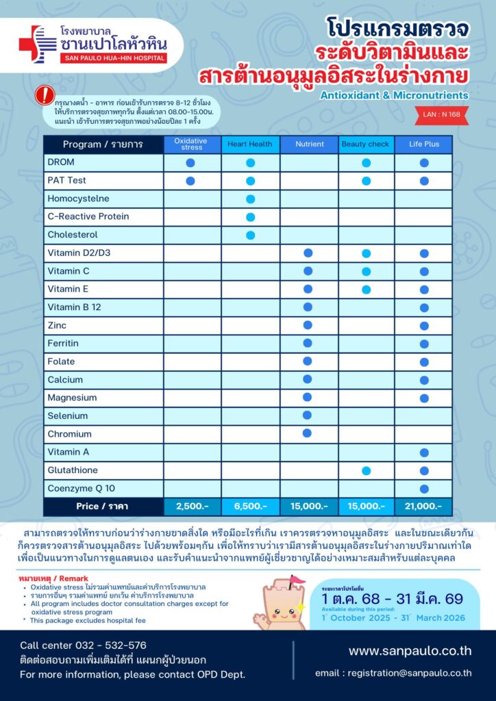 The San Paulo Hua-Hin Hospital’s Antioxidants and Micronutrients Package helps you discover what is a perfect balance of antioxidants and micronutrients in your body. Micronutrients help enrich your body and delay the aging process caused by free radicals. Every individual has different needs on their intake of vitamins and Micronutrients, which is why we use tailor-made programs to suit individual requirements. Maintaining proper vitamin levels will slow down the aging process and improve your quality of life.