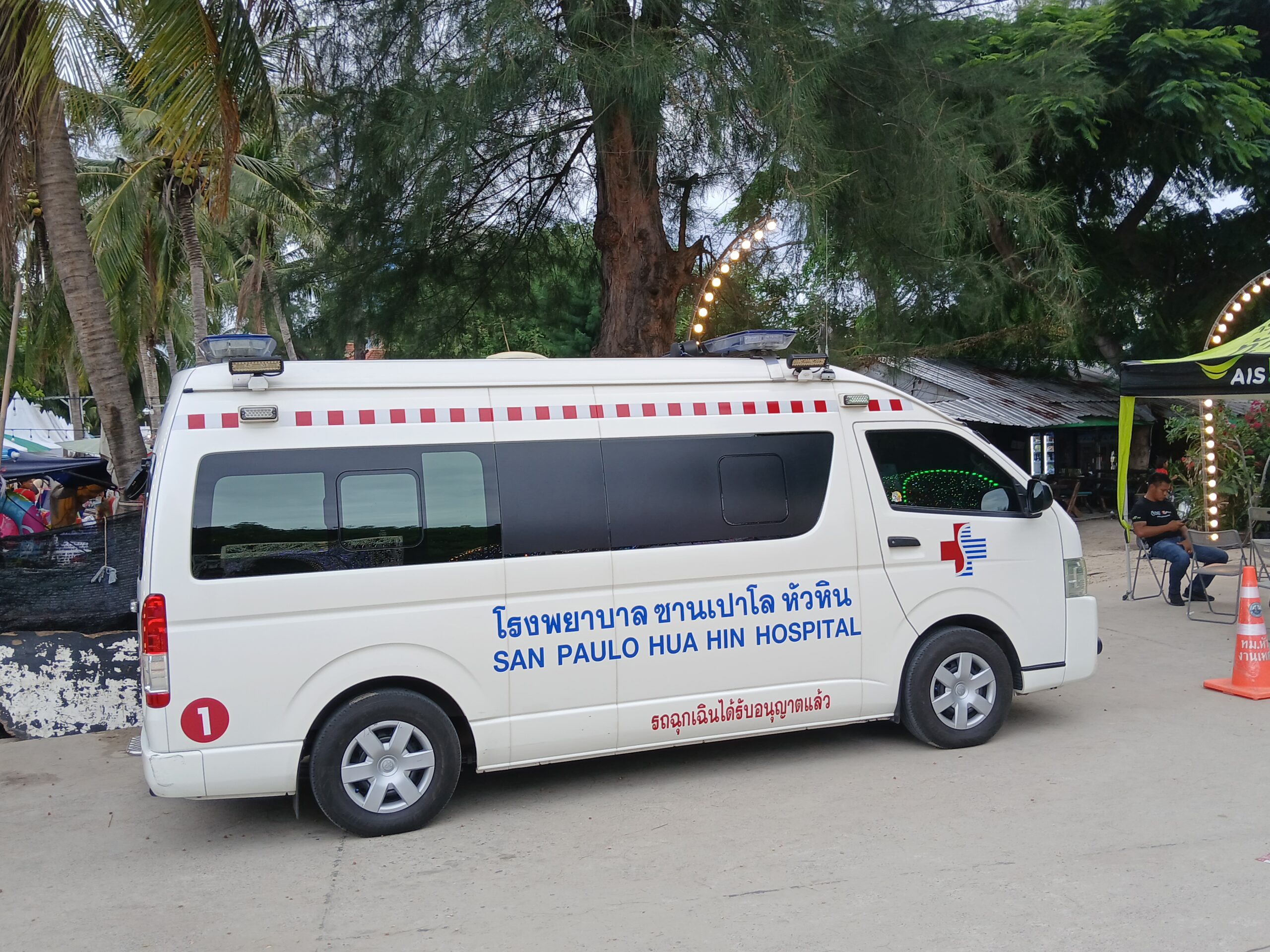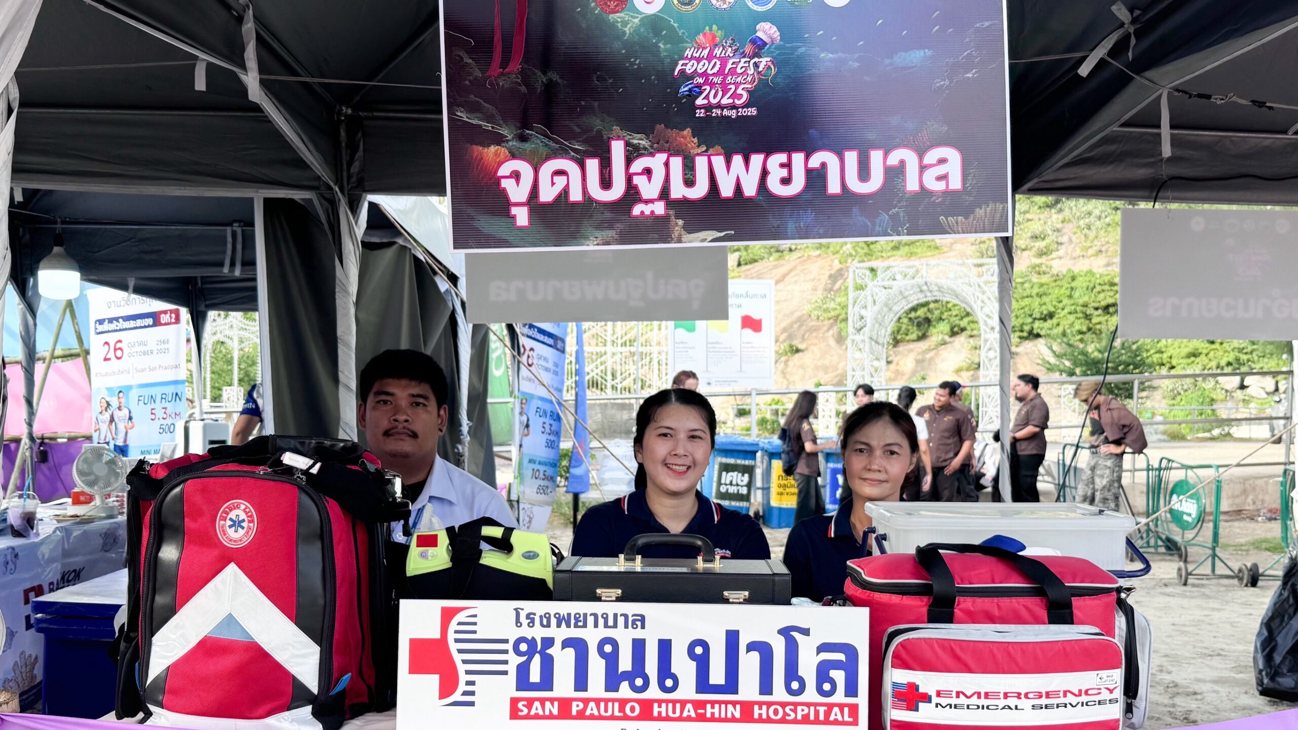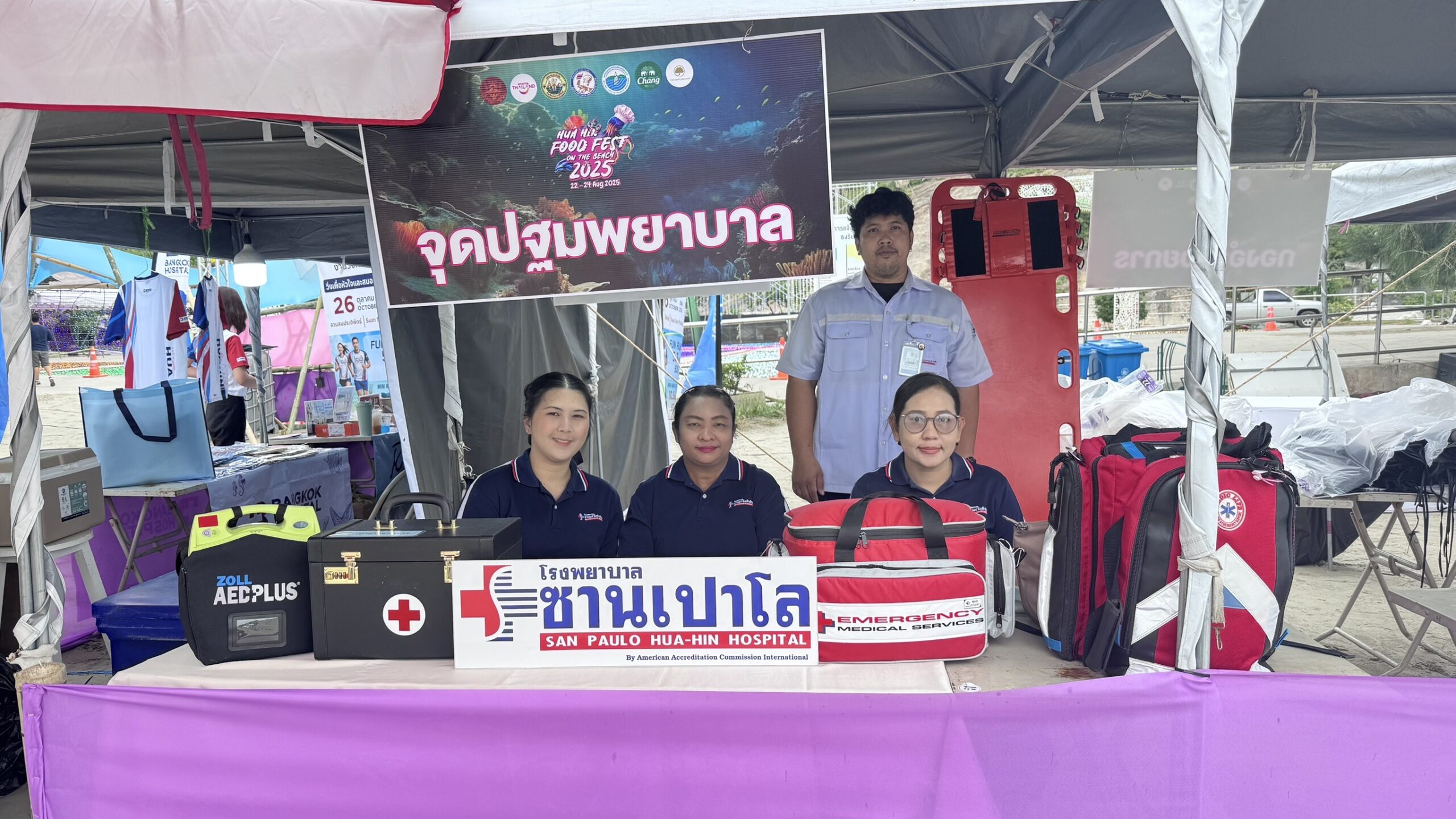นายสนิท คงกระพันธ์ ผู้จัดการแผนกการตลาดและประชาสัมพันธ์ ตัวแทน ผู้อำนวยการโรงพยาบาลซานเปาโล หัวหิน ได้นำทีมหน่วยปฐมพยาบาล รถพยาบาลฉุกเฉิน พร้อม อุปกรณ์ปฐมพยาบาลเบื้องต้น ร่วมงานเทศกาลอาหาร HUA HIN FOOD FAST ON THE BEACH 2025 เพื่อเตรียมความพร้อมหากมีเหตุฉุกเฉินแก่ประชนชนและเจ้าหน้าที่ผู้มาร่วมงาน