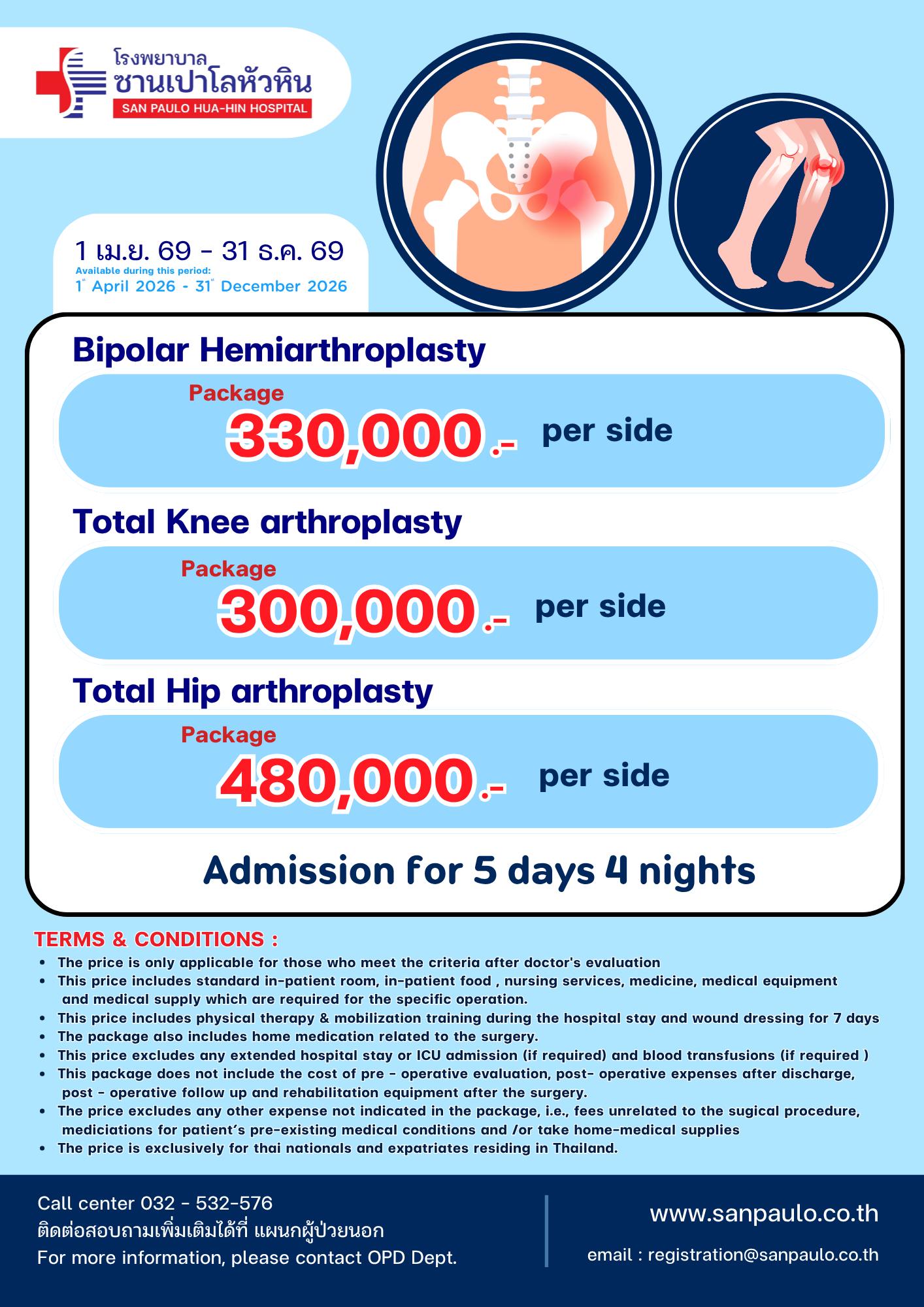 Regain your mobility with our specialized joint replacement surgery packages. San Paulo Hua-Hin Hospital offers comprehensive care packages for hip and knee arthroplasty, including a 5-day, 4-night hospital stay.