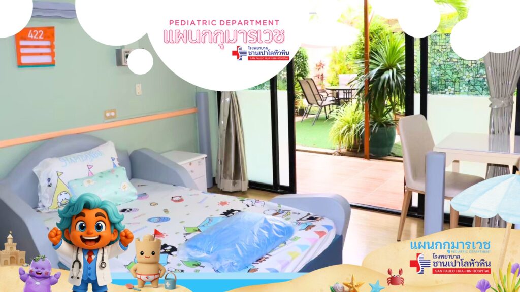 ทางโรงพยาบาลซานเปาโลหัวหินได้ปรับเปลี่ยน ตกแต่งห้องพักผู้ป่วยเด็ก ให้เป็นมากกว่าสถานที่รักษา แต่เป็นพื้นที่แห่งความอบอุ่นด้วยการออกแบบที่เน้นแสงสว่าง สีสันอ่อนโยน และเฟอร์นิเจอร์ที่ปลอดภัย เราสร้างสภาพแวดล้อมที่ช่วยลดความกังวลและส่งเสริมการพักผ่อนของลูกน้อยที่นี่ ทุกรายละเอียดถูกคิดมาเพื่อเยียวยาทั้งกายและใจ ให้การพักฟื้นเป็นช่วงเวลาที่ผ่อนคลายสำหรับทั้งครอบครัว เพื่อให้ผู้ป่วยและญาติได้สัมผัสประสบการณ์การดูแลสุขภาพระดับพรีเมียม ที่ผนวกความสะดวกสบายเหมือนอยู่บ้านเข้ากับการรักษาพยาบาลที่ได้มาตรฐานให้ลูกของคุณได้พักผ่อนในบรรยากาศที่เต็มไปด้วยความหวังและความสุข ณ ห้องพักผู้ป่วยเด็กโฉมใหม่ของเรา